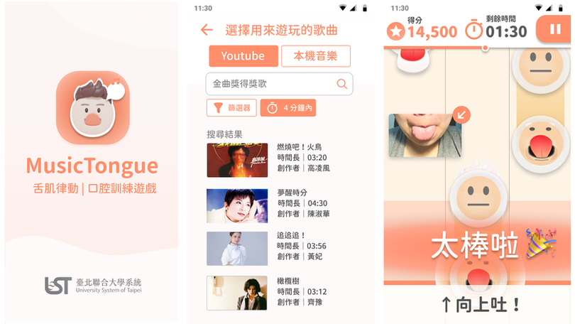 Music Tongue舌肌律動運動遊戲是一款結合音樂節奏和舌肌訓練的運動遊戲,針對中老年族設計,能夠提高舌肌的靈活度,減少老化過程中的舌肌退化問題。 自主口腔訓練操,是一種能夠提升吞嚥相關肌肉之肌力與協調性,維持口功能,預防吞嚥肌肉衰退的訓練運動。目前訓練方式單調、缺乏回饋,導致年長者運動的動機較為不足。